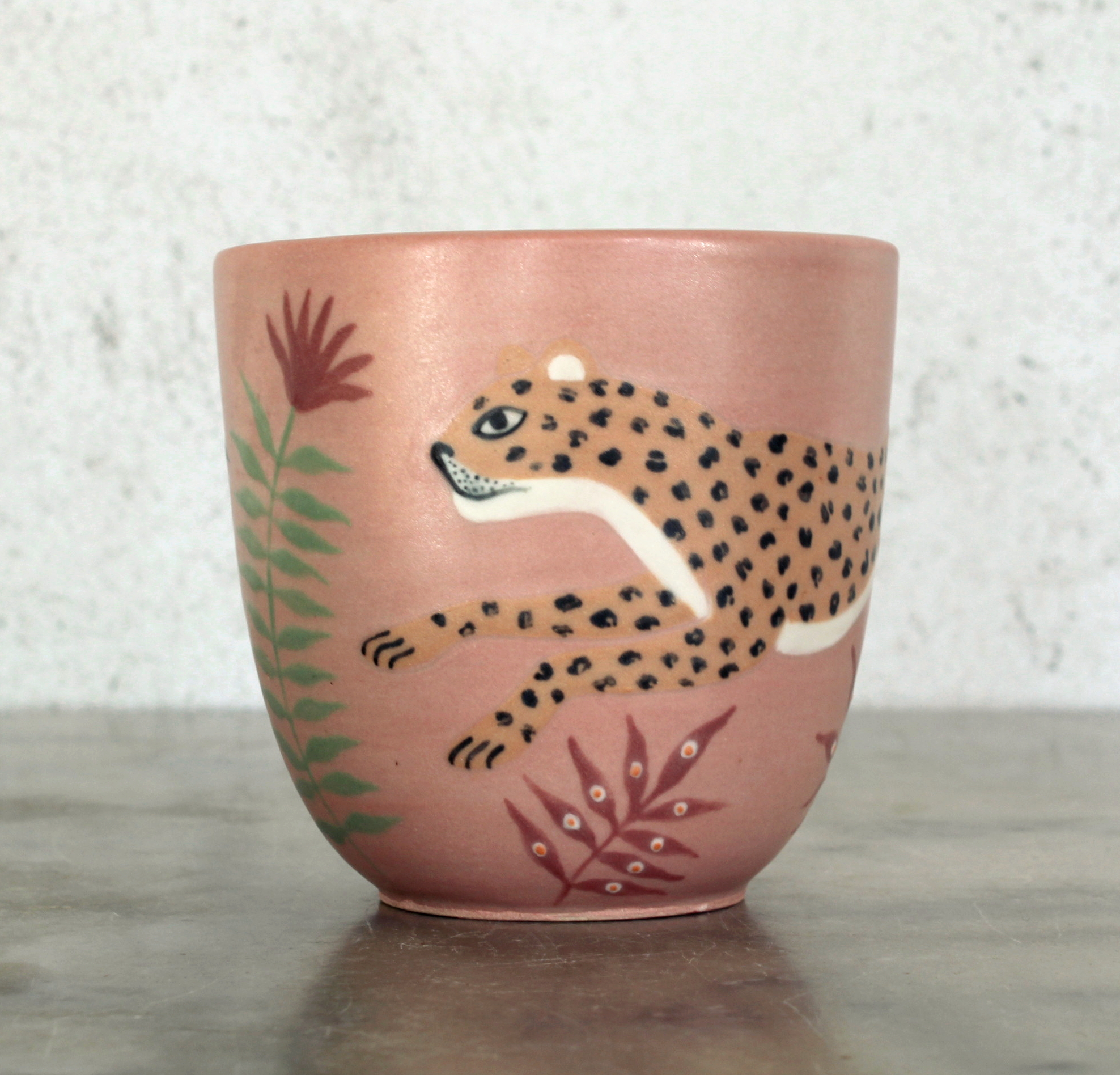Il est tourné en grès blanc, puis patiemment décoré au pinceau avant d’être cuit deux fois dans un four électrique (1265°C). La pièce est entièrement émaillée avec un émail satiné, pour un toucher velouté doux comme une peau de pêche.