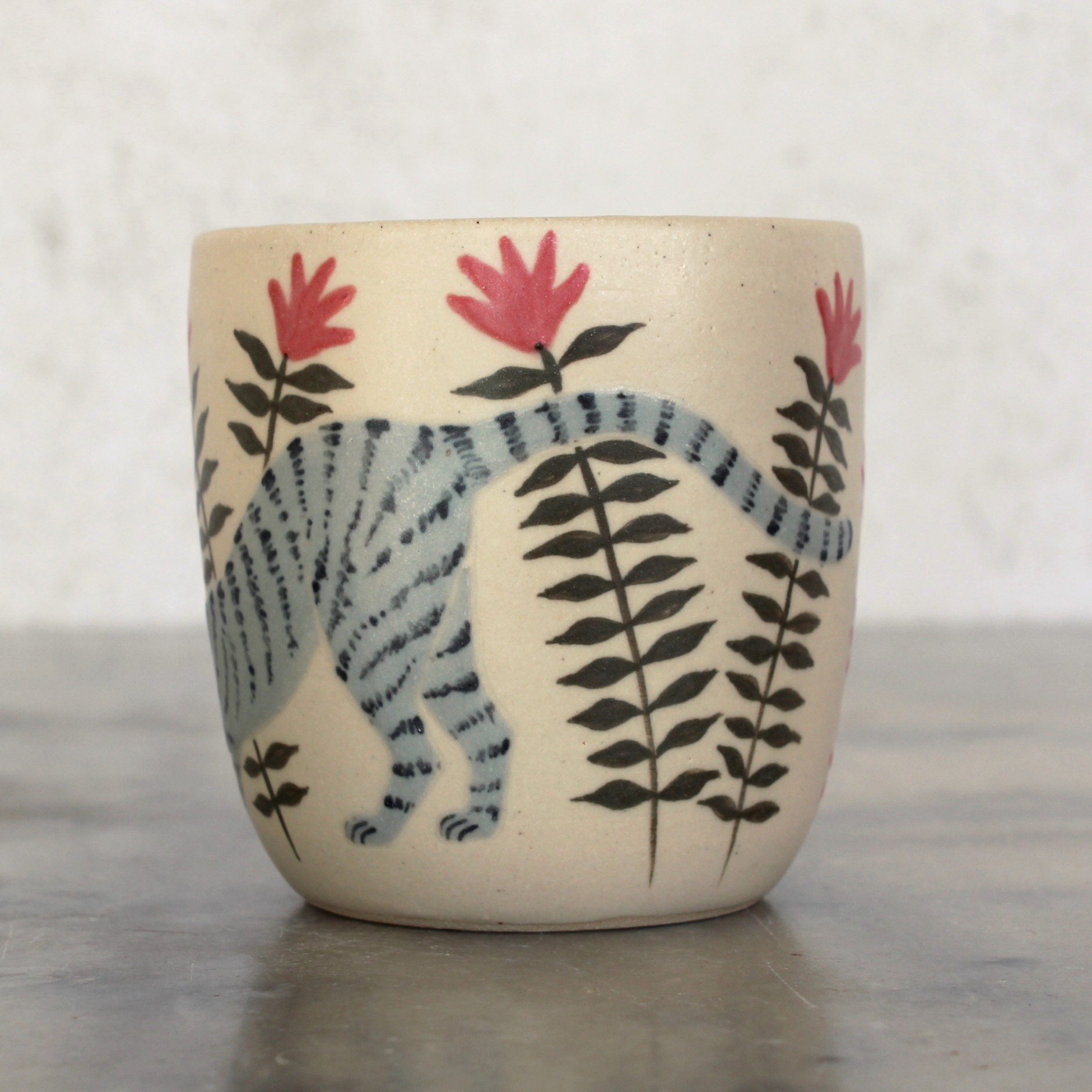 Elle est tournée en grès blanc puis patiemment décorée au pinceau avec des engobes fait maison.